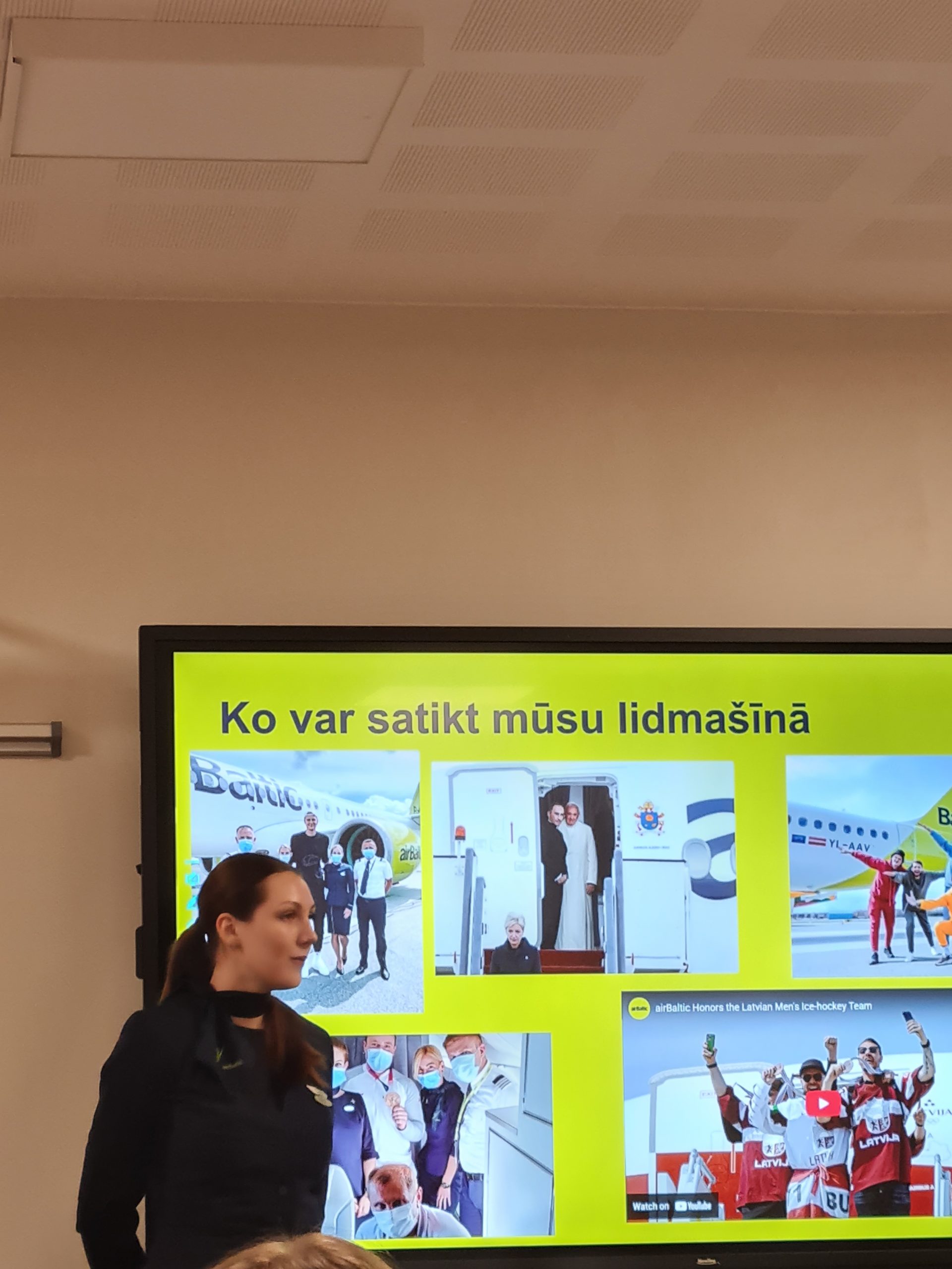 Amēlija pastāstīja par airBaltic vēsturi, sākot no 1995.gada. Šobrīd uzņēmumā strādā vairāk nekā 2800 darbinieki, tiek piedāvāti vairāk nekā 130 maršruti . Amēlijas kontā lidojumos pavadītas 626 stundas.