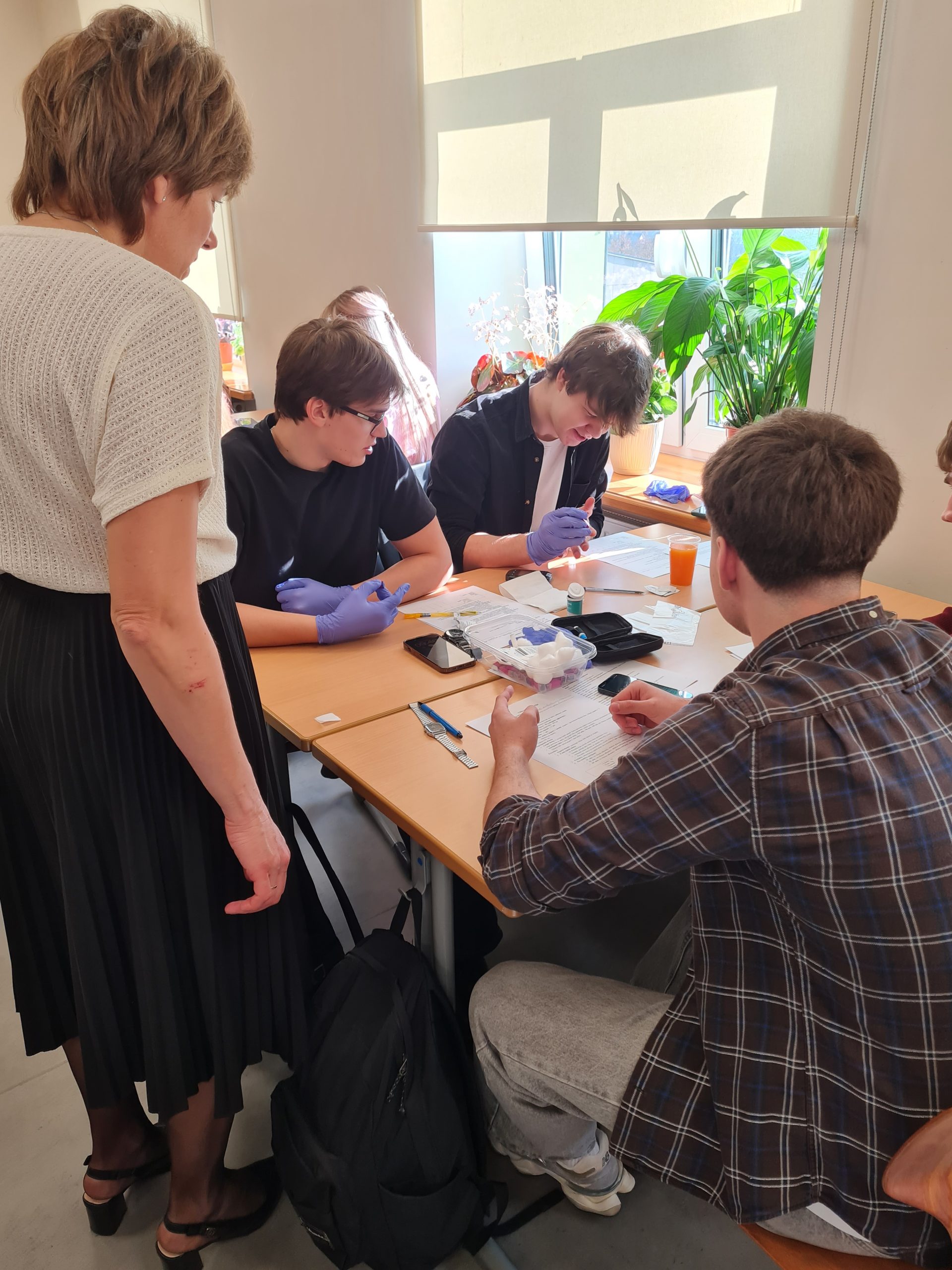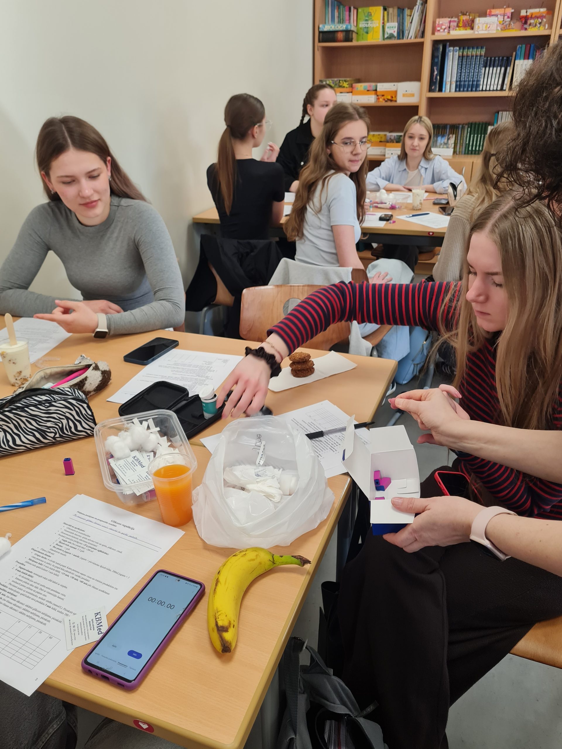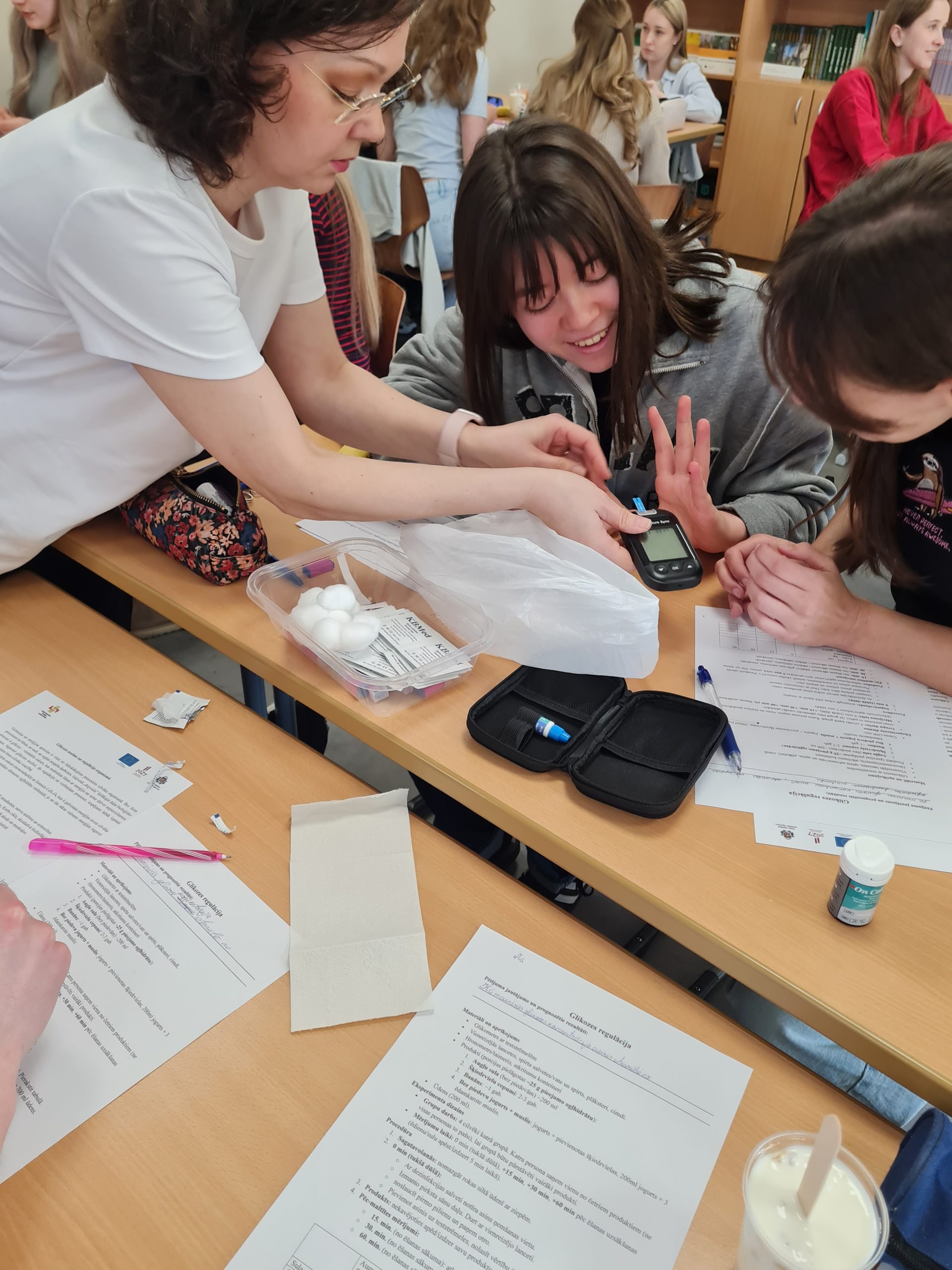 Interesants bija praktiskais eksperiments, kura sākumā katram dalībniekam tiek nomērīts glikozes līmenis kapilārajās asinīs. Pēc tam viņi lietoja uzturā vienādu daudzumu ogļhidrātu, bet dažādu pārtikas produktu veidā – piemēram, sulu, šķiedrvielu cepumus, jogurtu ar šķiedrvielām vai banānu. Tālāk glikozes līmenis tika atkārtoti mērīts ik pēc 15 minūtēm, lai novērotu, kā dažādi produkti ietekmē cukura līmeni asinīs. Papildus skolēni apguva higiēnas un dezinfekcijas prasības.