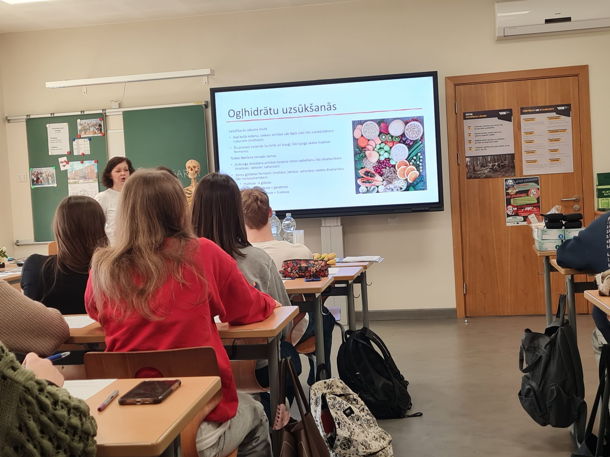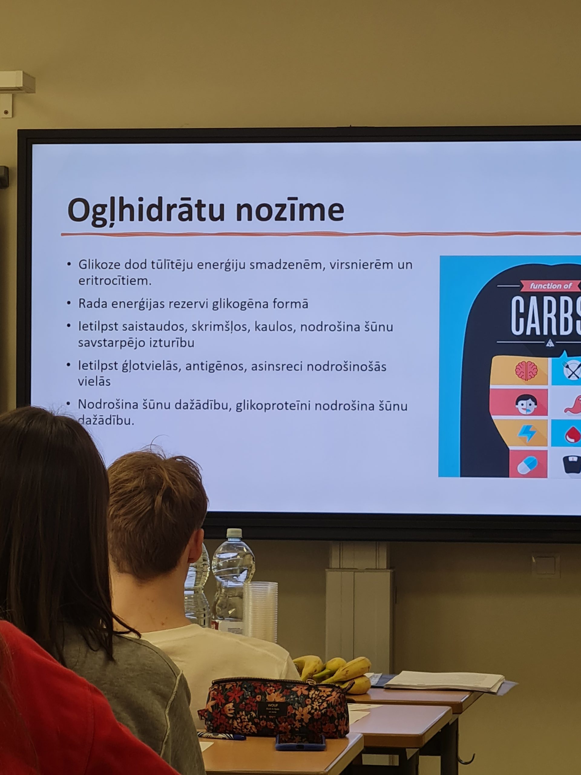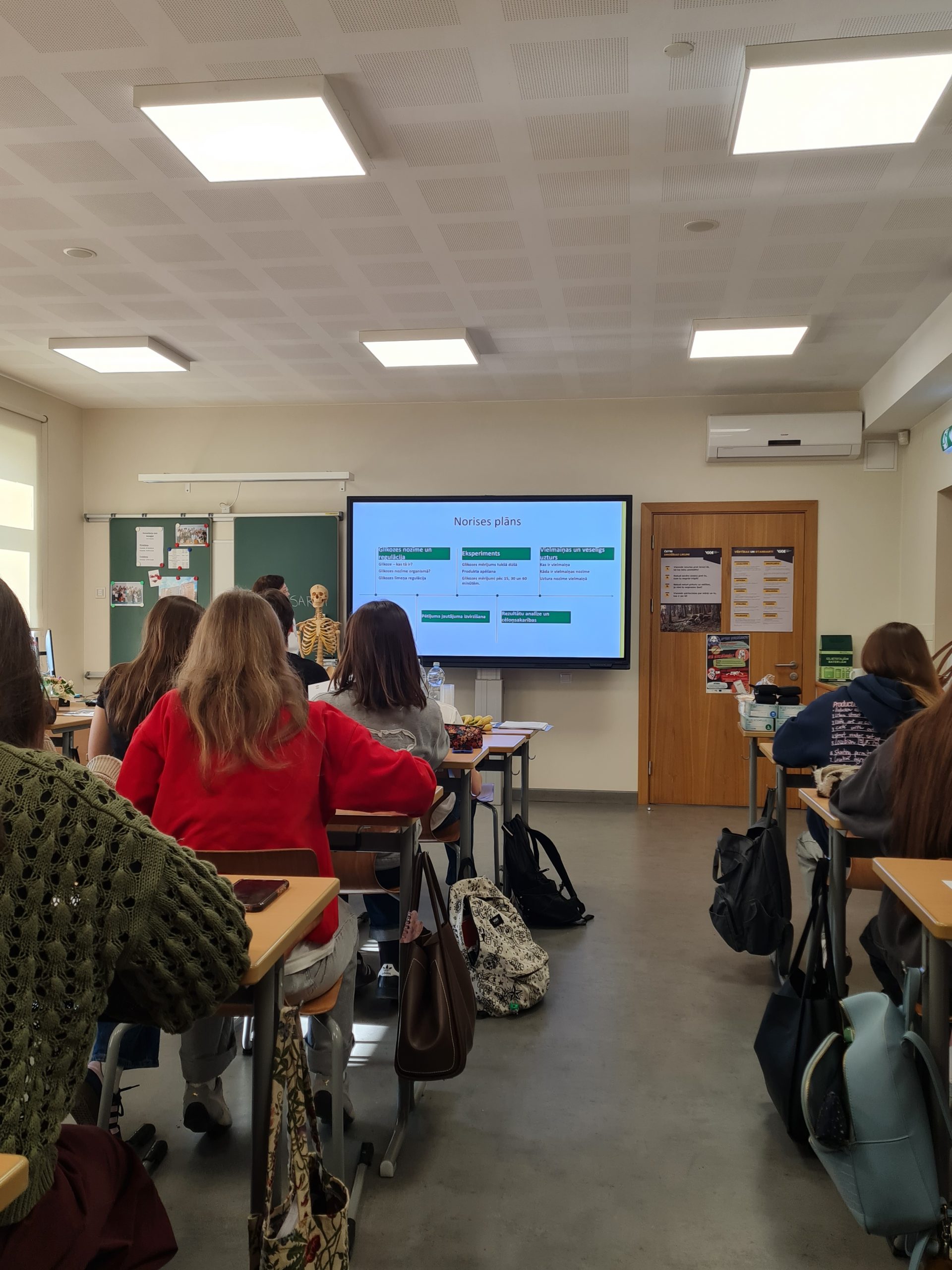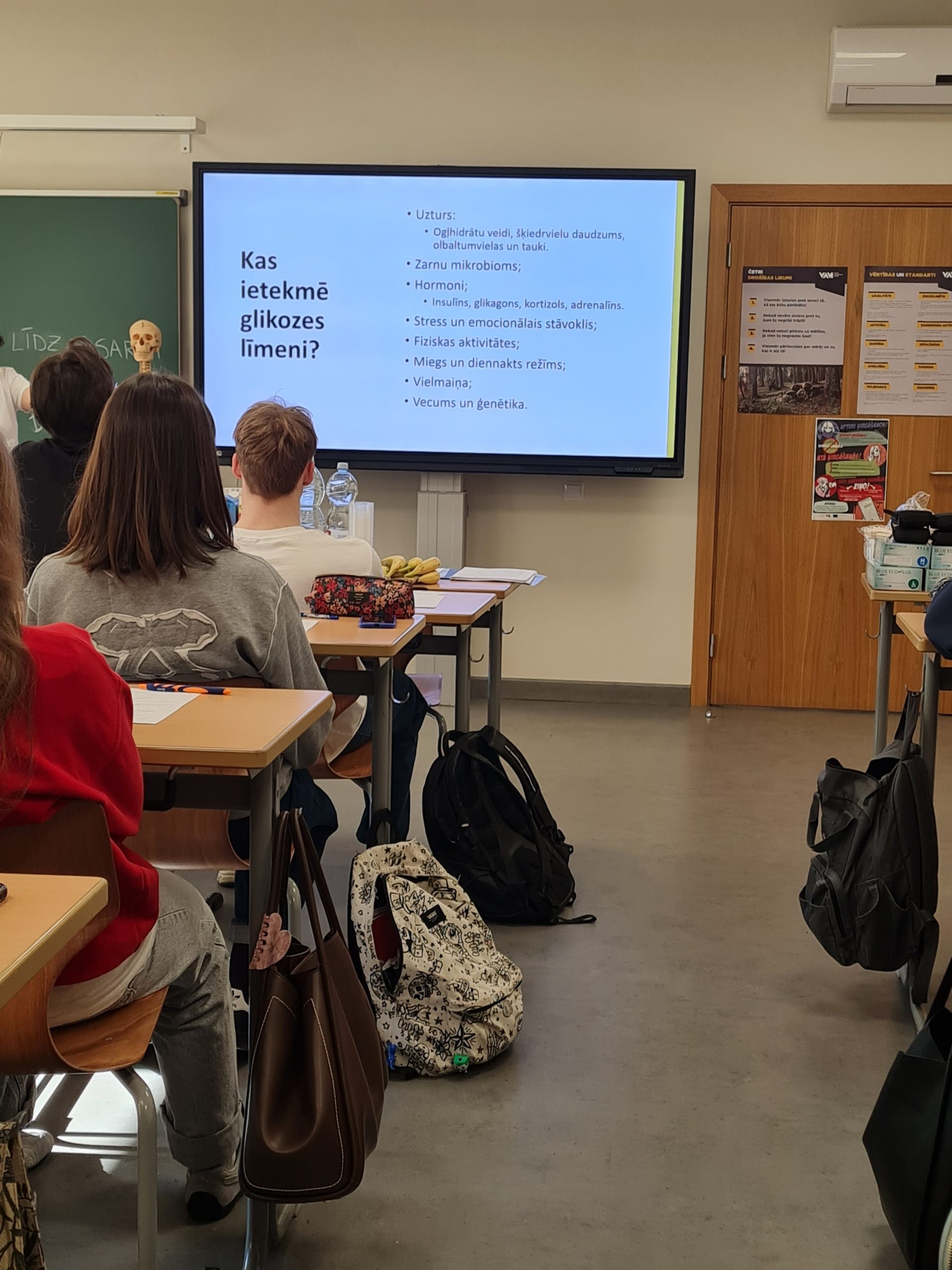 Koledžas lektore Iveta Miščuka prezentācijas laikā iepazīstināja skolēnus ar glikozes nozīmi cilvēka organismā – tās lomu kā enerģijas avotu, ietekmi uz organisma darbību un glikozes līmeņa regulāciju. Tika apskatīti faktori, kas ietekmē glikozes svārstības asinīs, kā arī veselīga uztura nozīme glikēmijas līdzsvara uzturēšanā.